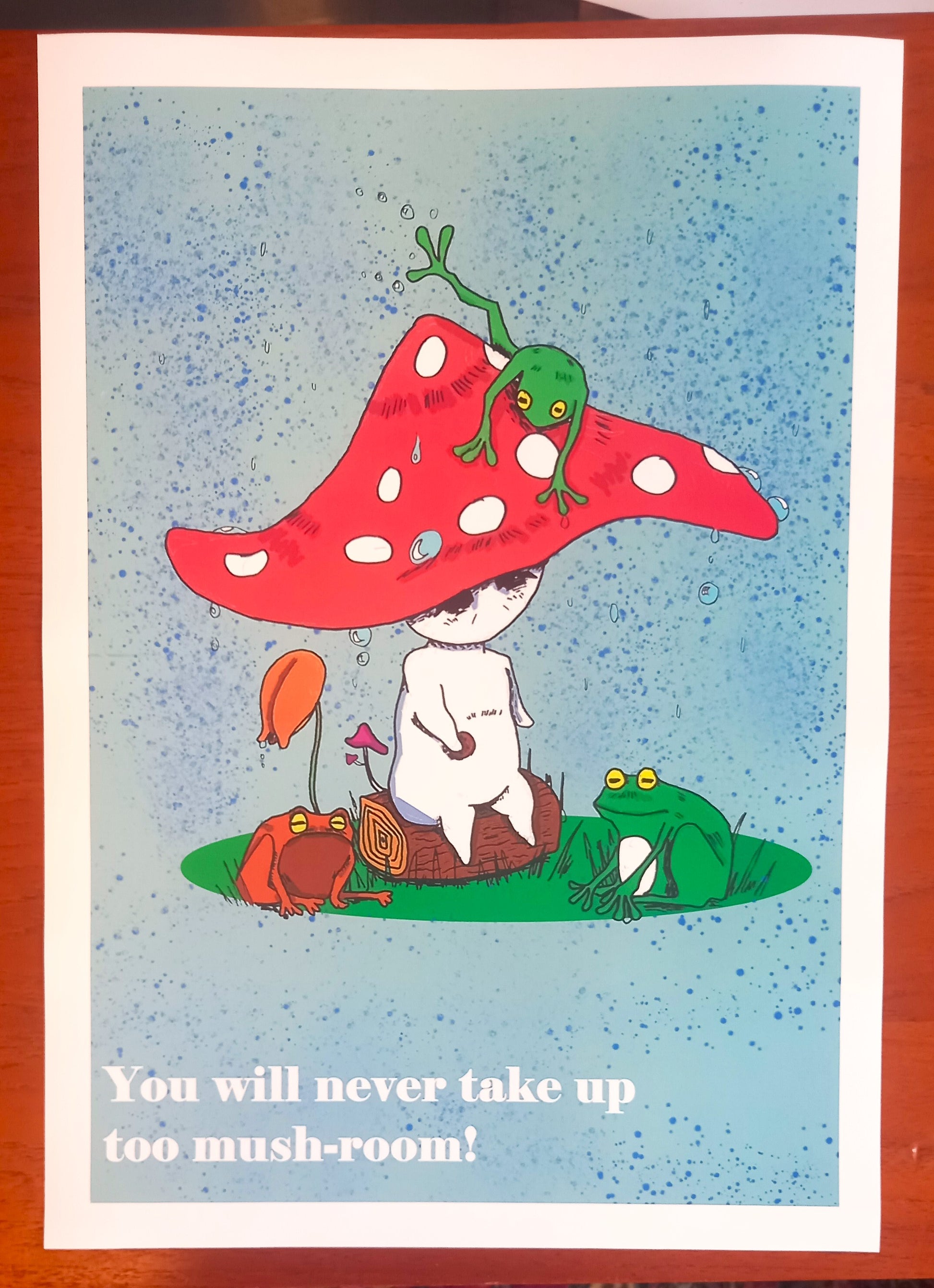 The poster, 'Sitting in the Rain' gives a meditative, contemplative vibe to the room. Some days when you feel like things are too much, take some time to reach out to others, reflect on yourself and let others support you. Everybody knows frogs are the best listeners! All posters are handcrafted by me!